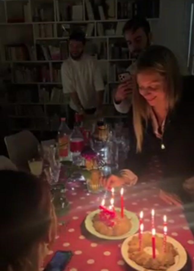 group of people gathered around a table with two cakes adorned with lit candles. One woman is lighting the candles, while another person is taking a photo with their phone. A man stands behind them, also taking a picture with his phone. Another man is standing in the background by a bookshelf. The table is covered with a red and white polka dot tablecloth, and there are drinks, flowers, and glasses on the table. The room is dimly lit, and the bookshelf is filled with books. The overall atmosphere appears festive, suggesting a birthday celebration.