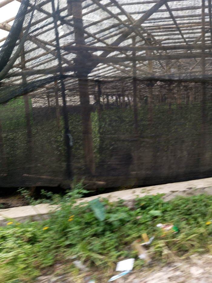 The image displays an agricultural facility in Cibodas, Indonesia, viewed from a slightly elevated perspective. The primary subject is a large, elongated shade house or greenhouse constructed with a framework of bamboo or wooden poles that form a grid pattern. This structure is covered entirely by a black, permeable mesh or netting, visible on both the sloped roof and vertical sides. Inside the structure, numerous rows of dense, green foliage are visible, indicating cultivated plants, extending deep into the background. In the lower foreground, a light-colored concrete ledge or low wall runs horizontally across the frame. Below this concrete barrier, a strip of ground is covered with various green grasses and weeds. Scattered debris, including small pieces of white and colored litter, is present among the vegetation on the ground. No individuals are visible, and no specific actions or interactions are depicted. The scene is illuminated by natural light, suggesting daytime.