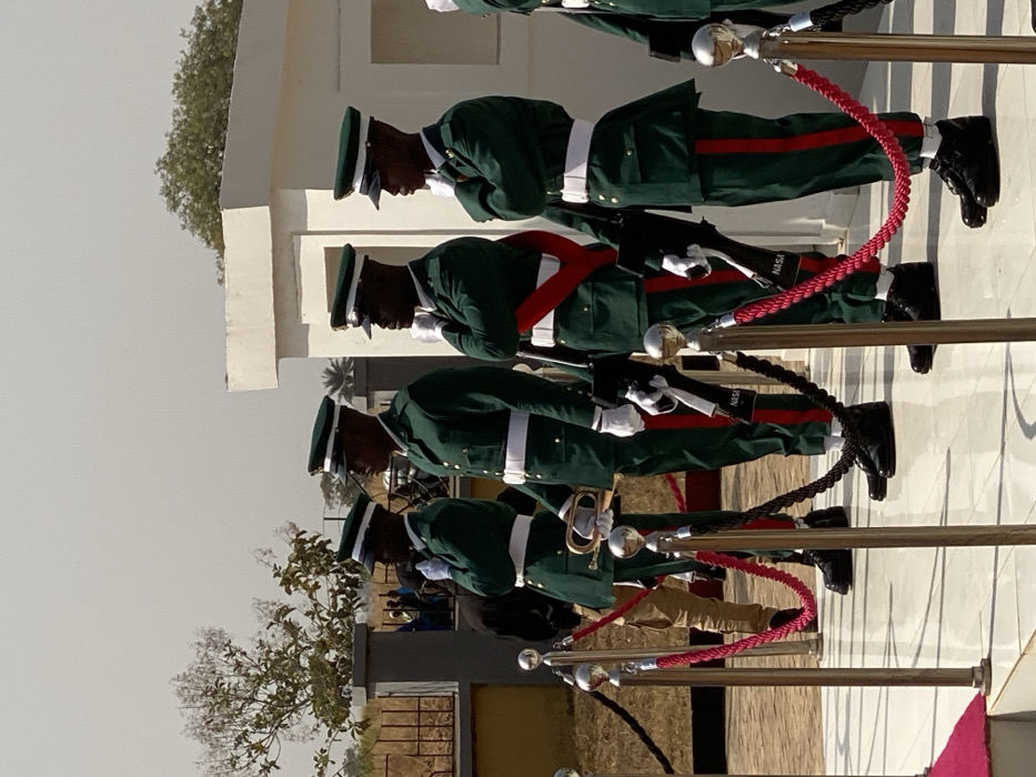 Five individuals in dark green military-style ceremonial uniforms stand in a line on a light-colored paved surface in Kachia, Nigeria. Each wears a peaked cap, white gloves, and a white belt over their dark green jacket and trousers, which feature a red stripe down the outer seam. The second individual from the left holds a brass bugle in his left hand. The third, fourth, and fifth individuals carry ceremonial rifles with "NASA" printed in white on a black element near the stock. The third individual also wears a red ceremonial sash. A series of silver stanchions linked by red and black braided ropes delineates the foreground, with a red carpet partially visible on the far left. Behind the uniformed figures, a light-colored building with a flat roof is visible. Further back, a metal fence separates the immediate area from a dry, open field containing sparse vegetation, including a tree with light-colored blossoms, and distant palm trees. A person in khaki trousers and a dark shirt is partially visible behind the second uniformed individual. All uniformed individuals face right, maintaining a formal, upright posture under a light grey sky.