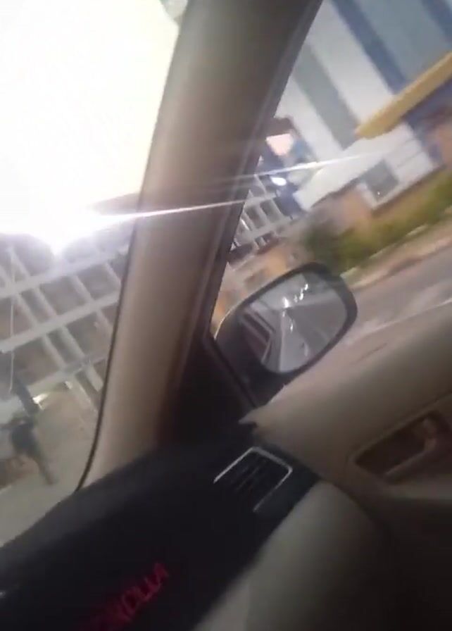A car, apparently a Toyota Corolla, is driving on a road adjacent to a building with multiple windows. The view is from inside the car looking toward the passenger side. The car passes the building. The car's side mirror is visible, reflecting the road behind. It is daytime. The sun is visible and bright.