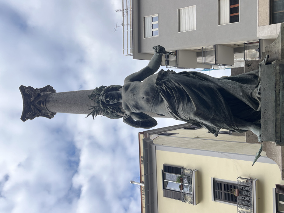 A large, weathered bronze monument occupies the central foreground, featuring a partially draped female figure standing before a tall, grey stone column with a classical capital