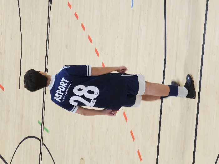 A person wearing a navy blue jersey with the number 28 and the word "ASPORT" on the back stands on a light-colored wooden floor. The jersey has white trim, and the person is also wearing navy blue shorts and socks. Black lines are visible on the floor, along with short, dashed red lines and a curved black line. The person's back is to the camera. The floor appears to be in a gymnasium or sports facility.