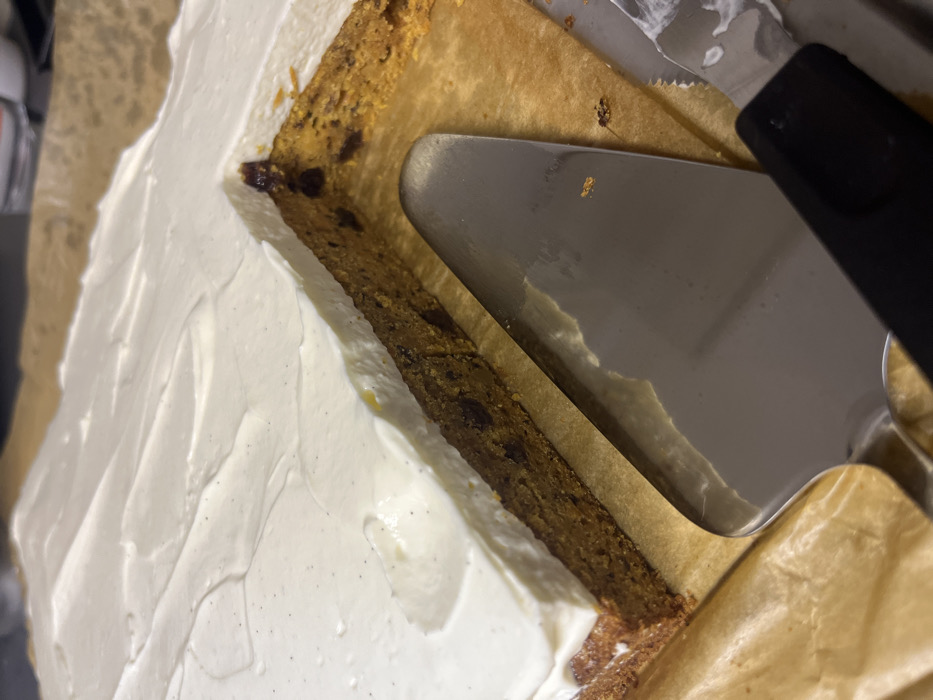 This image depicts a rectangular sheet cake with a portion removed, positioned on light brown parchment paper. The cake is covered with a thick layer of white frosting, which exhibits an uneven texture and contains small black specks, indicative of vanilla beans. The exposed interior of the cake reveals a dense, orange-brown crumb interspersed with dark brown inclusions, possibly chocolate chips or dried fruit. A silver-toned cake server, featuring a wide, flat, triangular blade and a dark handle, is situated in the foreground, partially underneath the cut section of the cake. A serrated knife with a dark handle is partially visible to the right of the cake server. No individuals are present in the scene. The background is indistinct and suggests an indoor setting, possibly a kitchen countertop. No specific visual identifiers within the image indicate the location as Meisenheim, Germany.