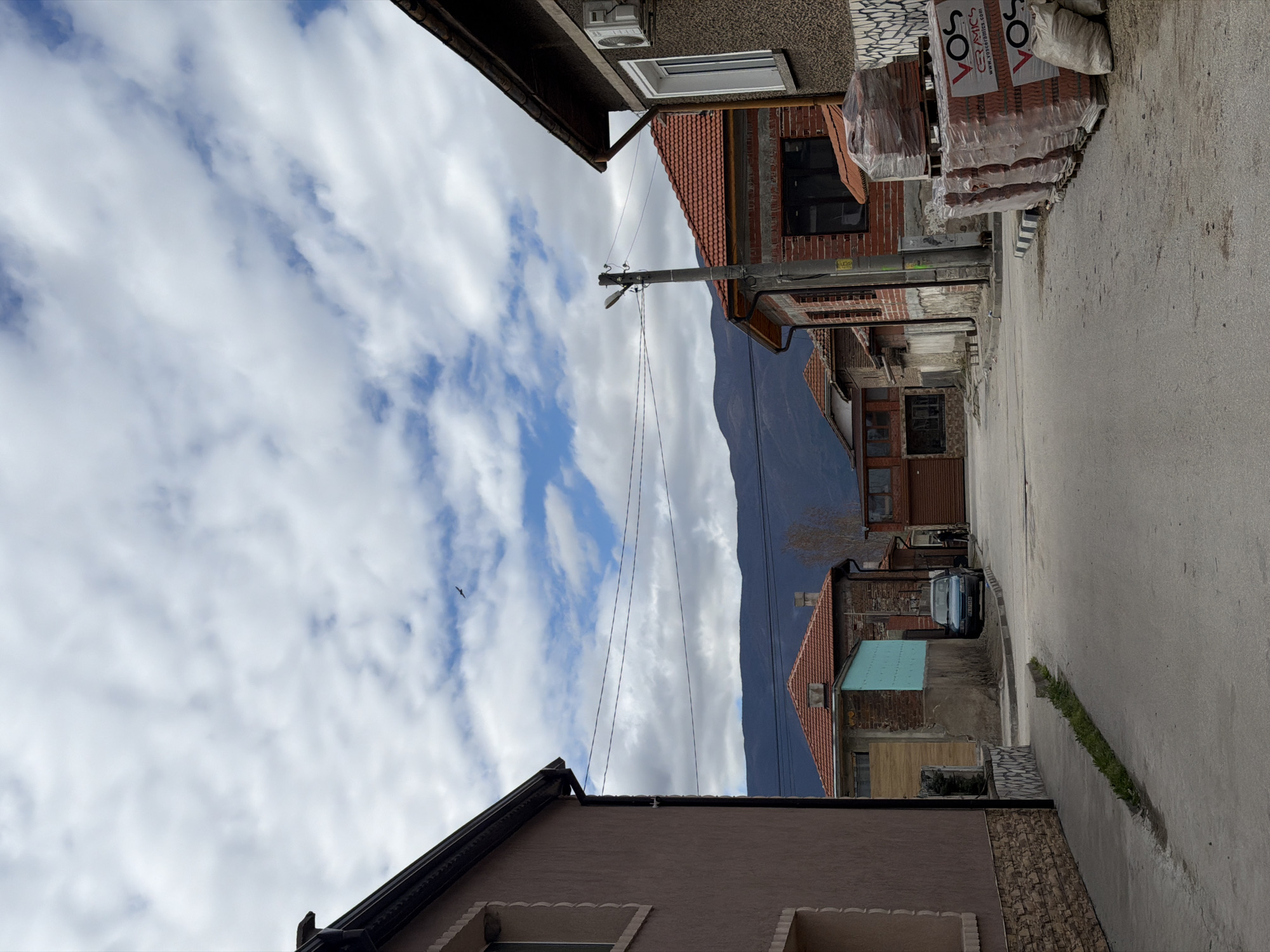 A vertical eye-level shot depicts a narrow street in Bratanitsa, Bulgaria. The road is bordered by buildings, some with brick and tile construction. A dark blue mountain range rises in the background. A light blue car is parked along the side of the street. Power lines stretch across the frame against a partly cloudy sky. There are stacks of wrapped building materials adjacent to one of the buildings. A bird is seen flying in the upper left quadrant.