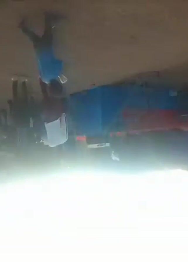 group of people gathered outside in an open area. The video is upside down. The people appear to be standing around what might be a stage or platform, covered in blue and red fabric. There are power lines visible in the background against a bright, cloudy sky. Music is playing. The general area looks like a simple, possibly rural setting.