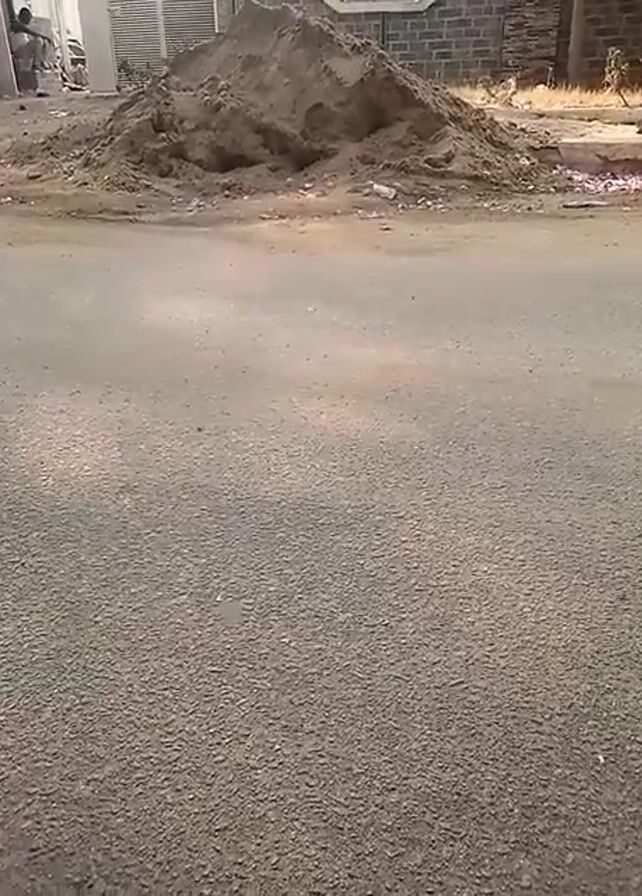 The camera faces a paved road with a large pile of dirt or sand on the roadside in the distance. A person sitting on a low wall or ledge is partially visible in the background. The background also features a building with a gray brick wall and a white gate. The road itself is composed of dark asphalt with a textured surface, reflecting sunlight. The pile of dirt is substantial, with an uneven, rough texture and visible shadows. The overall environment suggests an urban or suburban construction site or street undergoing repairs.