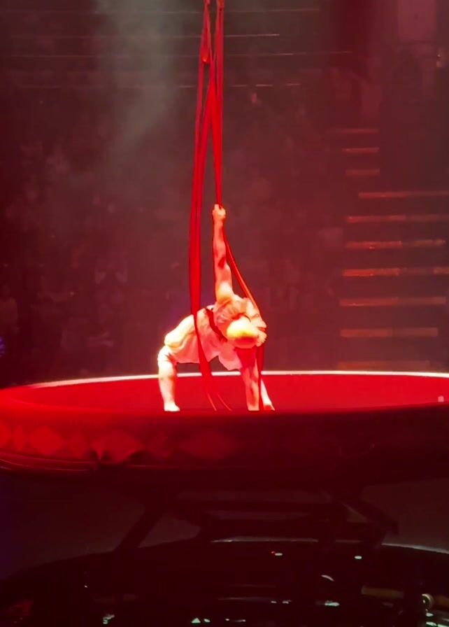 - "A person in a white outfit performs acrobatics on red aerial silks on a red stage in a theater with a large audience" by FM-cwY6A2, licensed under CC BY 4.0