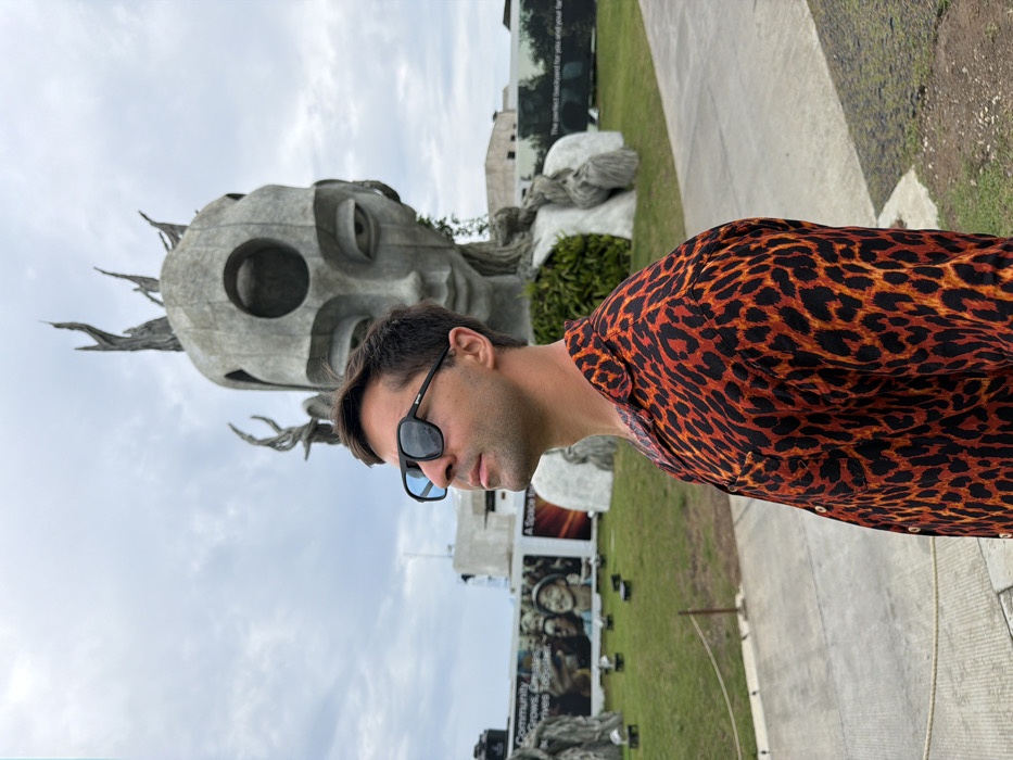 A male individual, seen from the mid-torso up in left profile, stands outdoors under an overcast sky. He wears a long-sleeved orange and black leopard print shirt and black-framed sunglasses with light blue lenses, gazing upwards and to the left. In the midground, a large, weathered grey sculptural bust of a stylized human head features a prominent circular void on the forehead and organic, root-like extensions from its crown. Green foliage is visible along the sculpture's base and neck. To the left of the sculpture, a manicured green lawn contains smaller, abstract grey sculptures and multiple ground-level spotlights. Further in the background, large billboards display photographic images of people and text, including partial phrases such as "Community Grows" and "A Space for." A light-colored building is visible behind the billboards, with a black water tank on a distant structure to the far left. The foreground consists of a dark concrete or paved pathway. This scene is located at the Garuda Wisnu Kencana (GWK) Cultural Park in Ungasan, Bali, Indonesia.