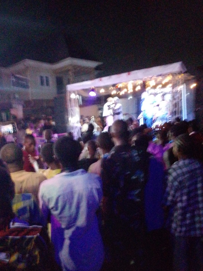 A crowd faces a lit stage at night. Silhouetted figures of performers stand on the stage beneath string lights. The audience members are diverse and their faces are mostly obscured. Behind the crowd and to the left, a two-story house is visible. The image quality is somewhat grainy, and the light is dim, adding to the night scene ambiance.