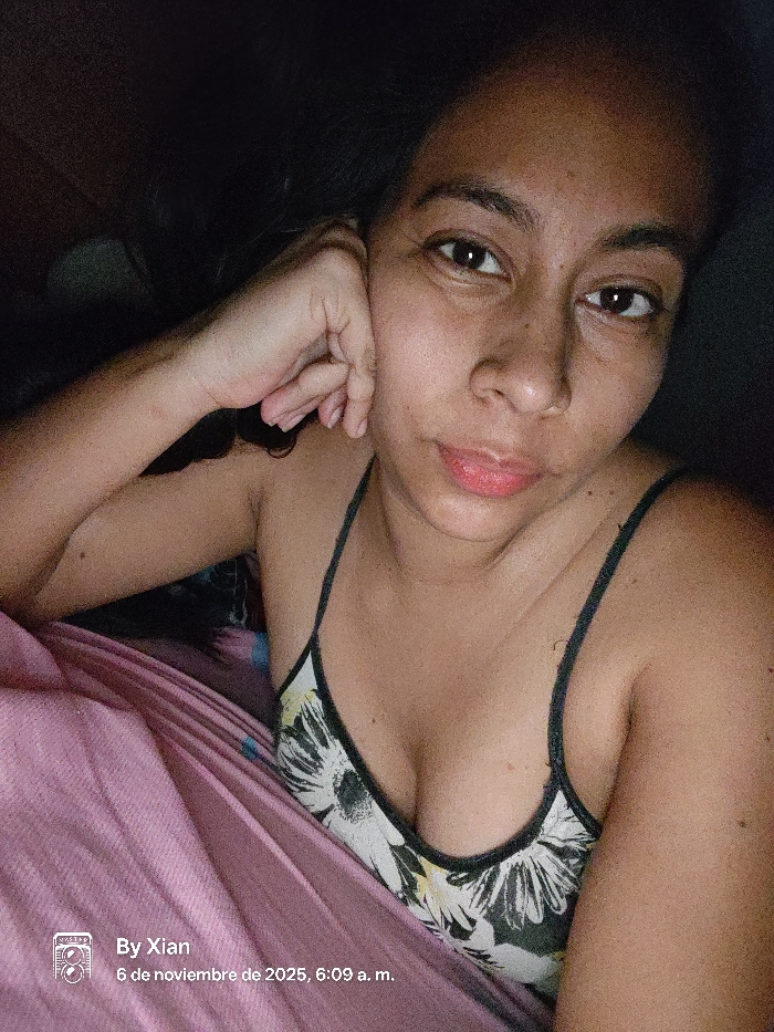 A female individual is depicted in a close-up, head-and-shoulders portrait, positioned against a dark, indistinct background. She has dark hair and eyes, with a medium skin tone. Her left hand rests with her knuckles against her left cheek and jawline. She wears a dark-colored top featuring white and yellow floral patterns on thin straps. A pink/mauve blanket or sheet covers her lower torso and partially extends over her right arm. Her gaze is directed towards the camera, maintaining a neutral expression. A digital watermark in the lower-left corner indicates "By Xian 6 de noviembre de 2025, 6:09 a. m." The environment suggests an indoor setting, likely a bedroom, under low light conditions, located in Cali, Colombia.