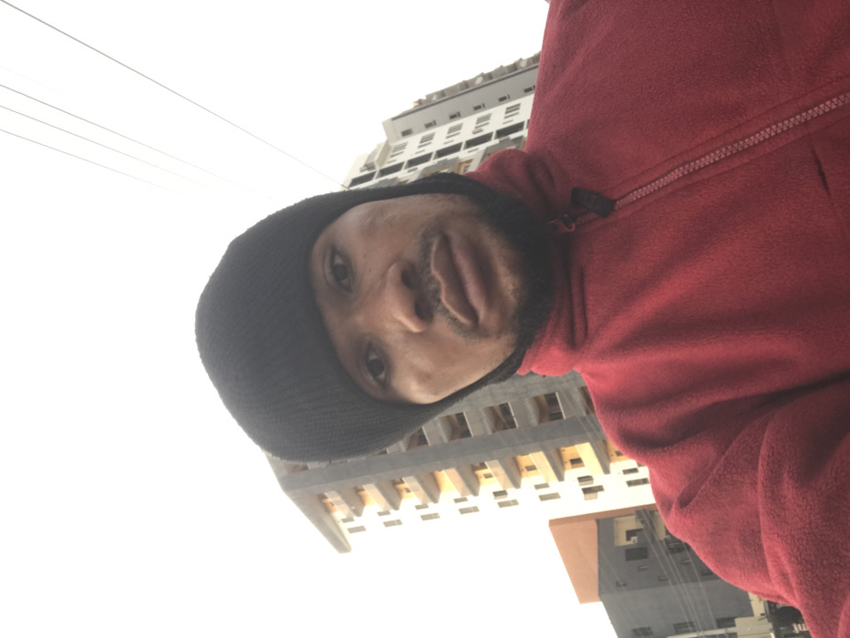 A selfie shows a person wearing a black beanie and a red fleece jacket. They are positioned at an angle, looking into the camera. Behind them, blurred in the background, stands a tall building. Power lines are visible in the sky. The lighting appears to be overcast or muted.