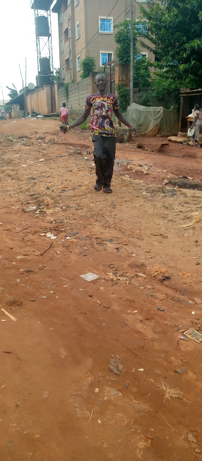 In the city of Ukwu-Abwa, Nigeria, an unpaved, reddish-brown dirt road is the central focus of the scene under an overcast sky
