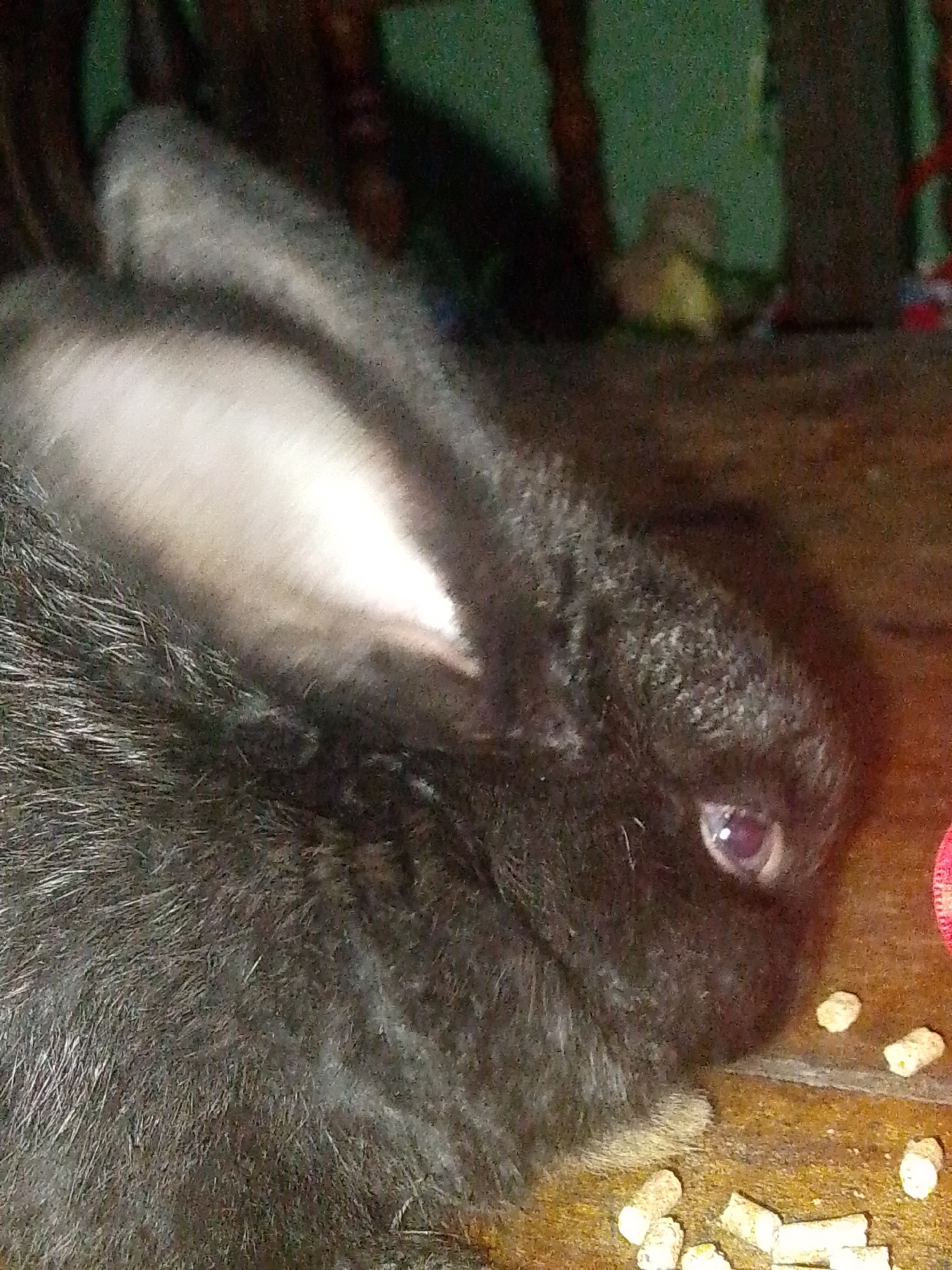 - "A close-up image depicts a black rabbit on a brown surface with scattered dry food pellets" by FM-Oe2JJ3, licensed under CC BY 4.0