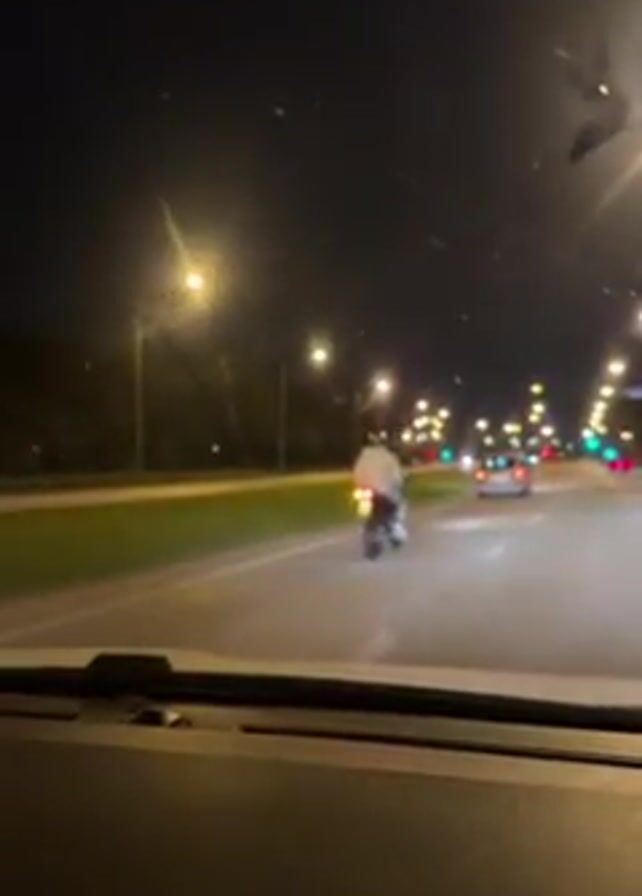 car driving on a lit road at night, with the point of view from the driver's seat. A person on a motorcycle is ahead of the car, moving in the same direction. The driver's navigation system is visible in the dashboard, showing a map. The road has streetlights and a green median. Other vehicles are also on the road, with their headlights visible in the distance.