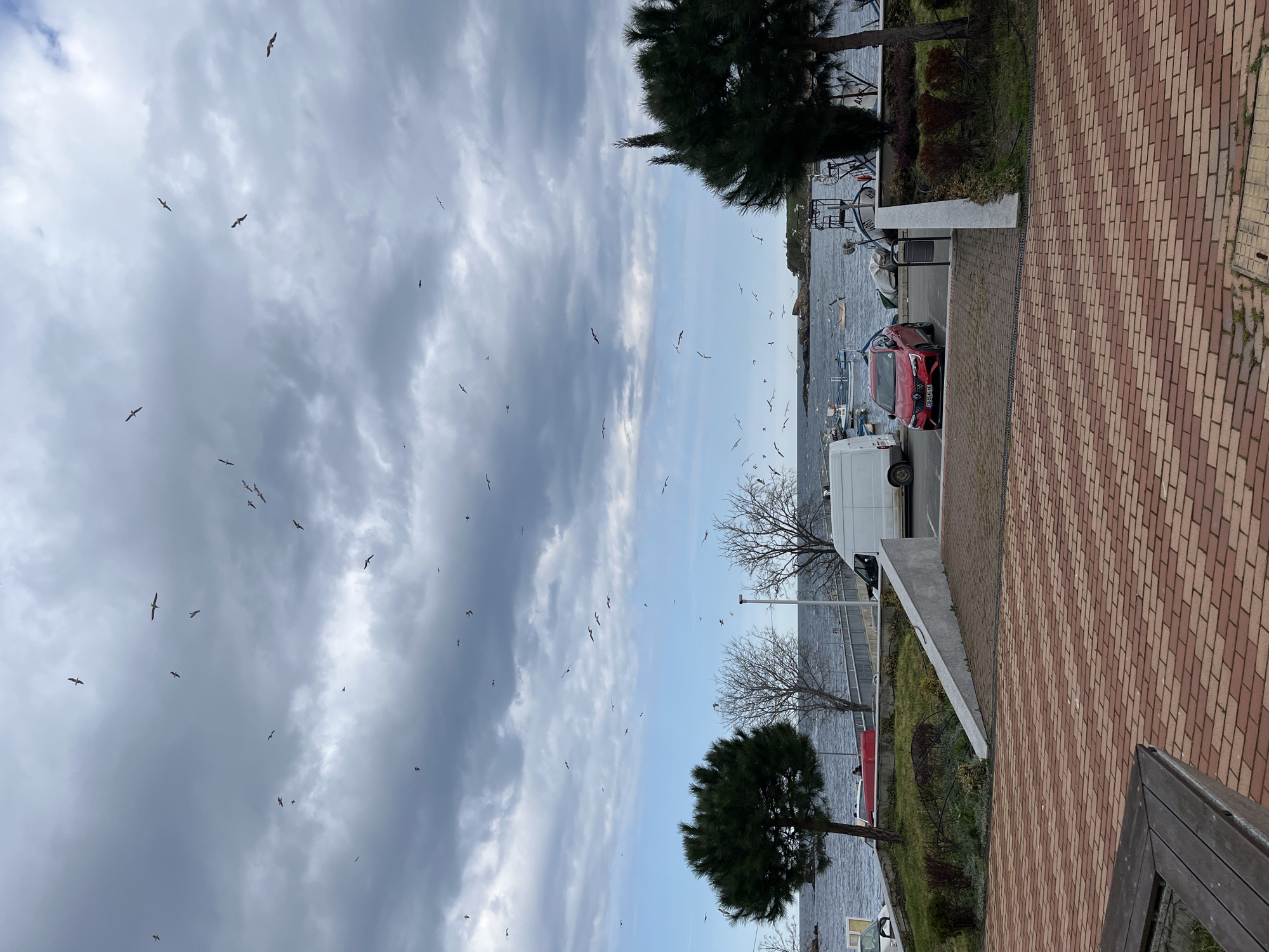coastal scene in Ahtopol, Bulgaria. The sky is cloudy, with numerous birds flying. The scene also includes a waterfront area with a red-and-white brick walkway. Cars are parked near the water. There are several trees scattered across the scene.