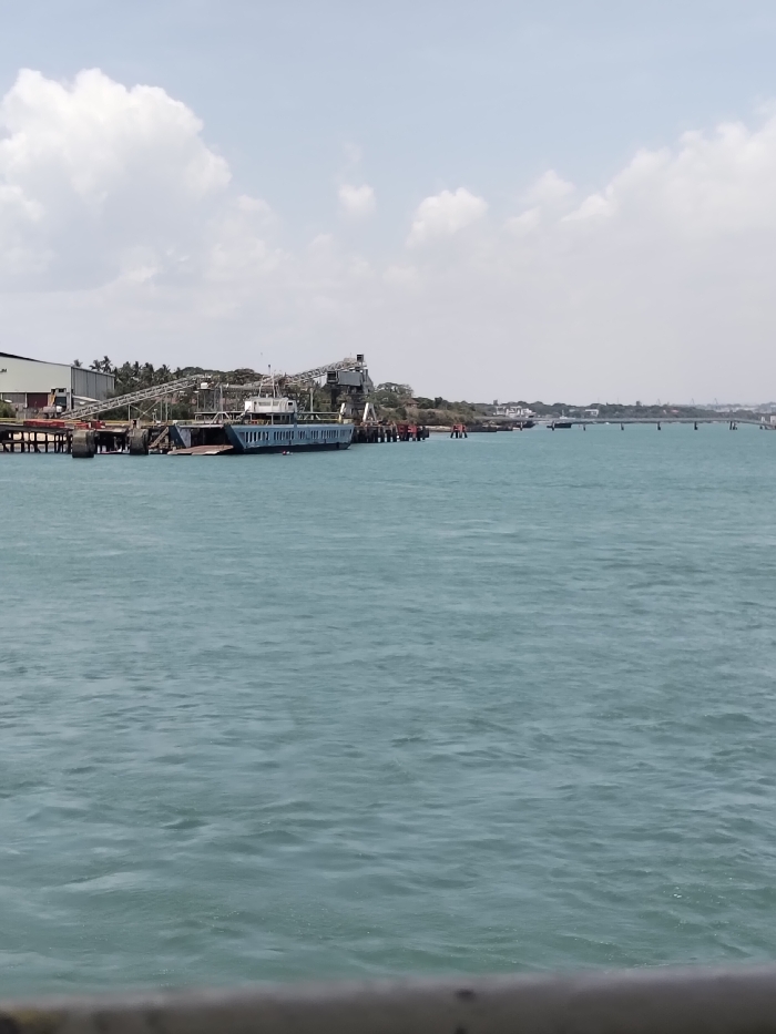 The image depicts a coastal scene in Mkomani ward, Kenya, under a partly cloudy sky. The foreground is occupied by a blurred gray horizontal bar. The midground features a wide expanse of turquoise-blue water with visible ripples. In the background, on the left, a large, dark blue vehicle ferry is docked at a pier. The ferry has a white superstructure and an open ramp visible at its stern. Behind the pier, a large industrial building with a light-colored roof is present, alongside a prominent metal conveyor system extending inland. Palm trees and dense green vegetation line the shoreline behind these structures. To the right of the ferry, several red and black mooring posts are positioned in the water near the land. Further right and extending into the distance, a series of dark pillars or buoys delineate a path or channel in the water, with a small, light-colored boat visible further along the distant coastline. No individuals are discernibly visible.