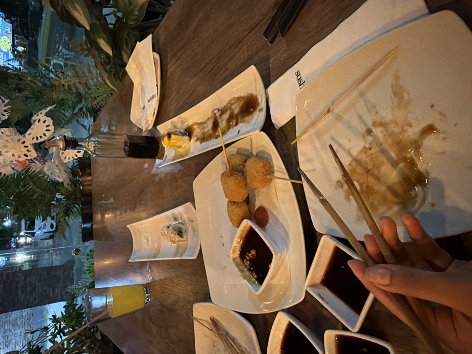 A table setting with multiple plates of unfinished food. There's sushi, skewers with fried items, and small dishes of dark sauce. Chopsticks rest on an empty plate. A hand is holding another pair of chopsticks. A glass of yellow liquid and a bottle are also visible. Outside, greenery and building lights are visible.