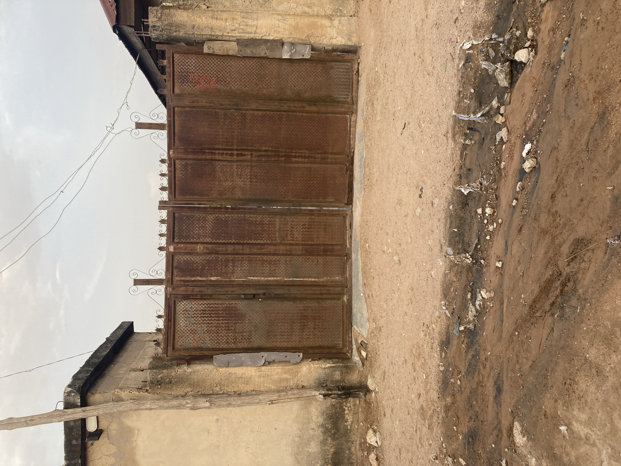 rusty, dark metal gate centered in the frame. The gate is composed of several horizontal panels with a repeating diamond pattern on the top and bottom panels. Decorative metal scrollwork is visible on the top of the gate. The gate is flanked by weathered concrete walls on both sides. To the right of the gate is a dirt road or path, showing signs of recent rain or dampness. Debris, including small rocks and bits of trash, is scattered along the edge of the road. The sky overhead appears overcast. The location is Unknown, Unknown.