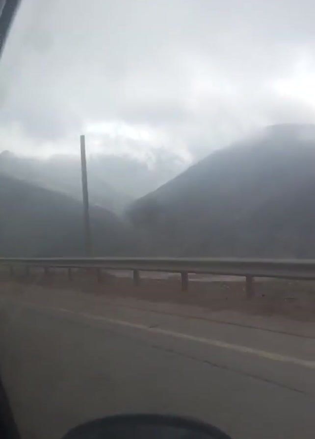 view from a car driving on a road, with misty mountains in the background. The road has a metal guardrail along the side and a yellow line. The sky is overcast and the lighting is dim. A pole stands beside the guardrail. The side mirror of the car is visible in the lower left corner of the frame. The ground between the road and guardrail is a mix of dirt and gravel. The mountains in the background are shrouded in fog, partially obscuring their details.
