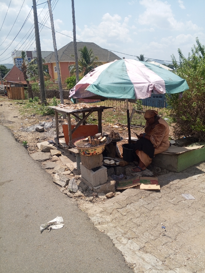 The scene depicts an outdoor food vendor stall positioned along the unpaved shoulder of an asphalt road in Adankolo, Nigeria, under bright daylight