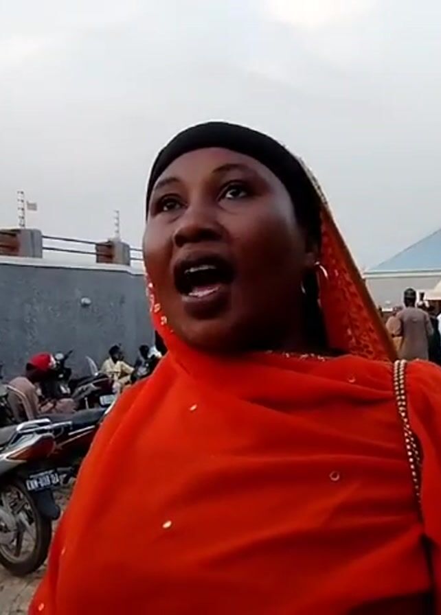 Here is a detailed description of the video: **Scene:** The video appears to be shot outdoors, likely at a gathering or event. The setting looks somewhat informal, with cars and motorcycles parked nearby. In the background, there is a building with a dome-like structure and what looks like a party tent. **People:** - The main subject is a woman wearing an orange headscarf and an orange outfit. She is facing the camera and speaking. - In the background, there are several other people, some dressed in traditional clothing. A young girl in a similar orange outfit walks into the frame for a brief moment. **Objects:** - Cars and motorcycles are parked nearby. - A grey wall with a black fence and a solar panel are also in the background. **Actions:** - The woman in the orange outfit is speaking directly to the camera. - Other people are milling about in the background. **Interactions:** - The woman in the orange outfit appears to be giving an interview or making a statement to the camera. **Environment:** - The sky looks overcast, suggesting it might be either early morning or late afternoon. - The area appears to be paved, possibly a parking lot.