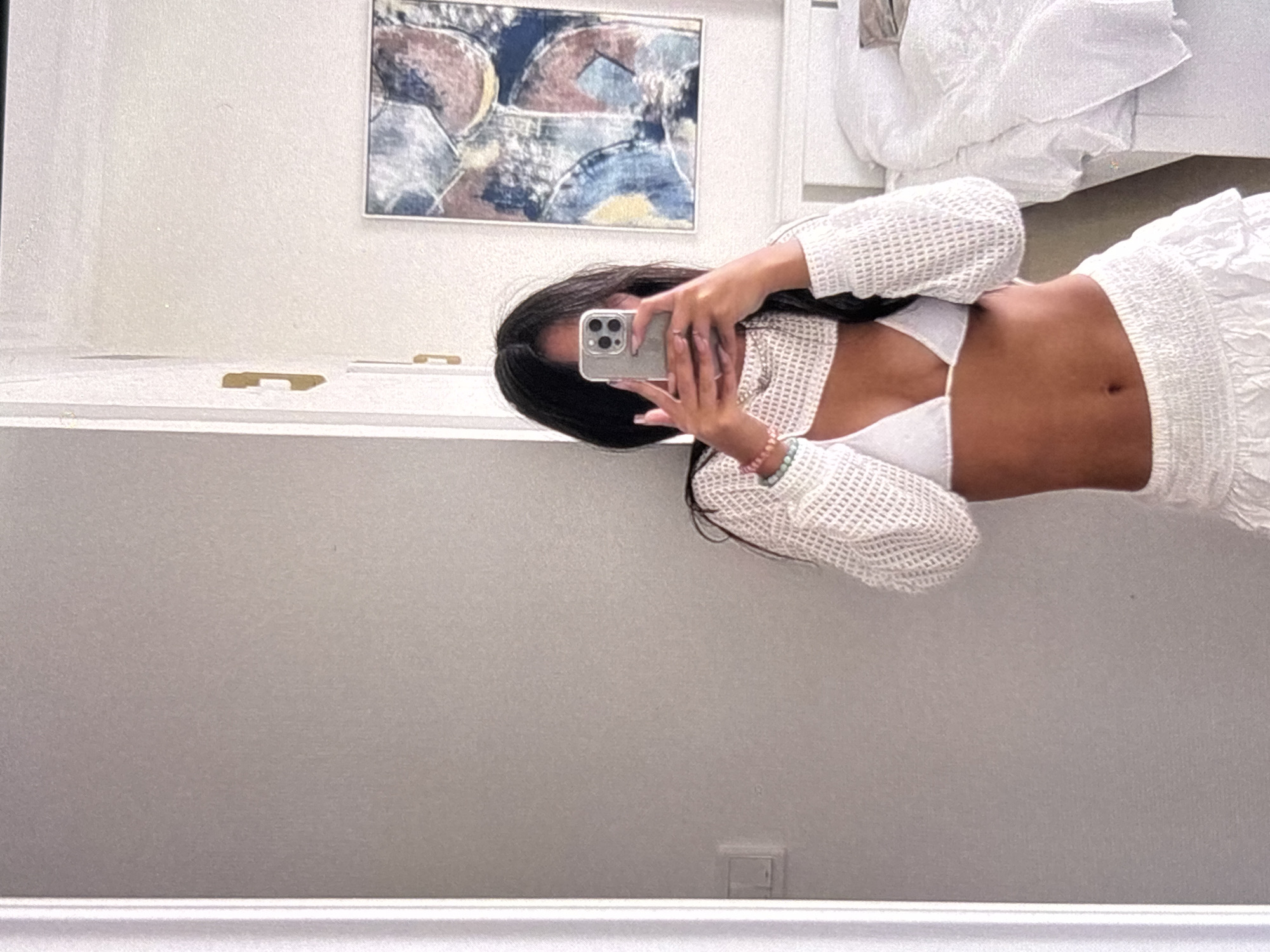 A person is taking a selfie in a bathroom with a mirror. The person is wearing a white bikini top and a white skirt. The person is holding a silver iPhone in their hands, covering most of their face. The bathroom has a white countertop and a white wall. There is a piece of artwork on the wall behind the person. To the right and slightly above the person is a white bed with white bedding.