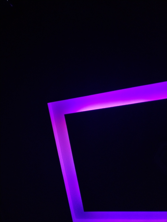 The image displays a dark, featureless background, predominantly black, against which a luminous geometric structure is prominently featured. This structure is composed of thick, uniformly glowing magenta-purple light, forming a distinct 'L'-shaped outline. The internal corner of this 'L' points towards the lower-right portion of the frame. One illuminated segment extends diagonally from the upper-right area towards the central-left, while the other segment extends diagonally from the upper-left area towards the central-right. The light appears to be emitted from an integrated strip, casting a bright, diffuse purple luminescence. No individuals, additional objects, or discernible actions are present within the frame. The scene is located in Plovdiv, Bulgaria.
