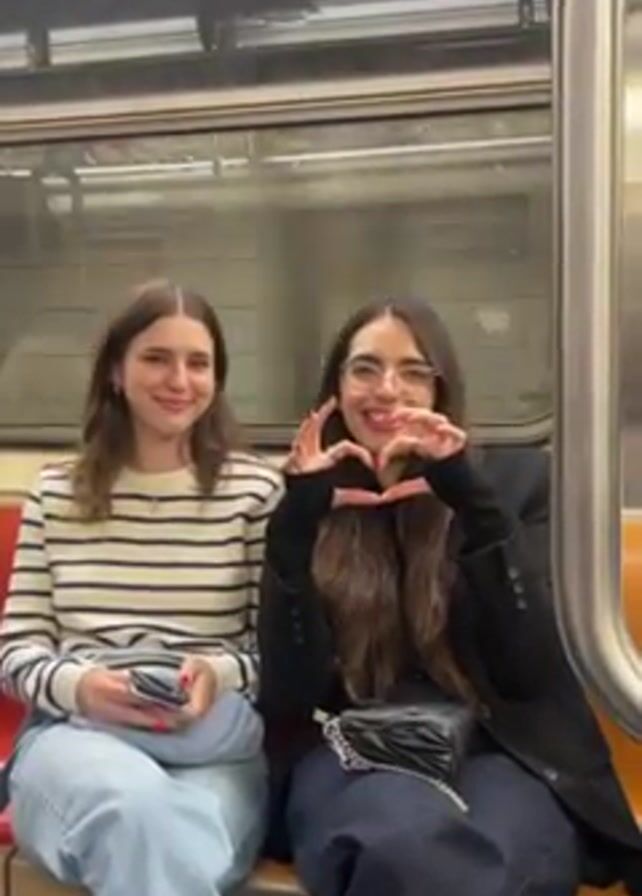 Two young women are sitting next to each other on a subway car. The woman on the left is wearing a striped sweater and light blue jeans. She is holding a phone. The woman on the right is wearing a black blazer and jeans and has eyeglasses on. She is making a heart shape with her fingers. The subway car has orange seats and gray walls.