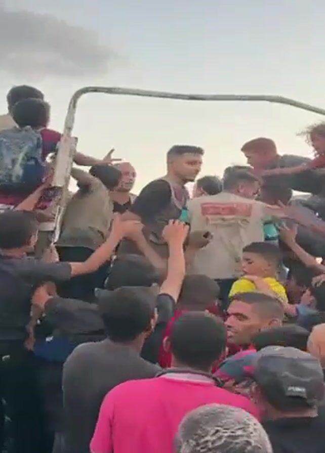 large group of people, primarily young men, crowded around and on a white vehicle, possibly a truck. Many are reaching up towards the vehicle, attempting to climb on or hand something to someone on top. One man on the vehicle seems to be the focus of attention, possibly distributing something. The crowd appears eager and agitated. The setting appears to be outdoors, under an overcast sky.