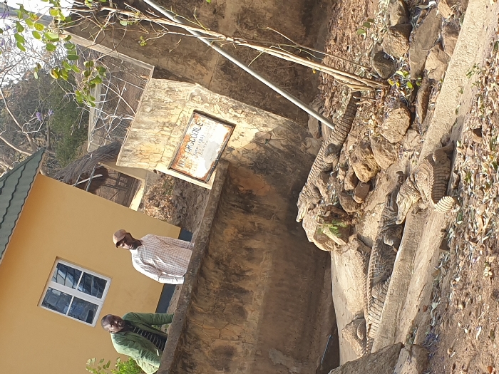 This image depicts an outdoor crocodile enclosure at the Jos Wildlife Park in Jos, Nigeria, under bright daylight conditions