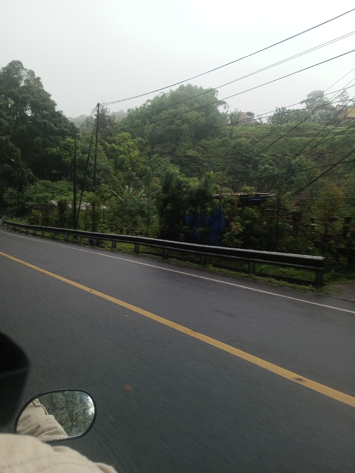 A winding road with a solid yellow line stretches into the distance, bordered by a metal guardrail. Lush, dense foliage covers the hillside beyond the rail, with trees obscuring parts of what appear to be utility poles and overhead wires. The sky is overcast and foggy, creating a subdued, gray light. A motorcycle mirror and part of a person's clothing are visible in the foreground, suggesting the photo was taken while in motion.