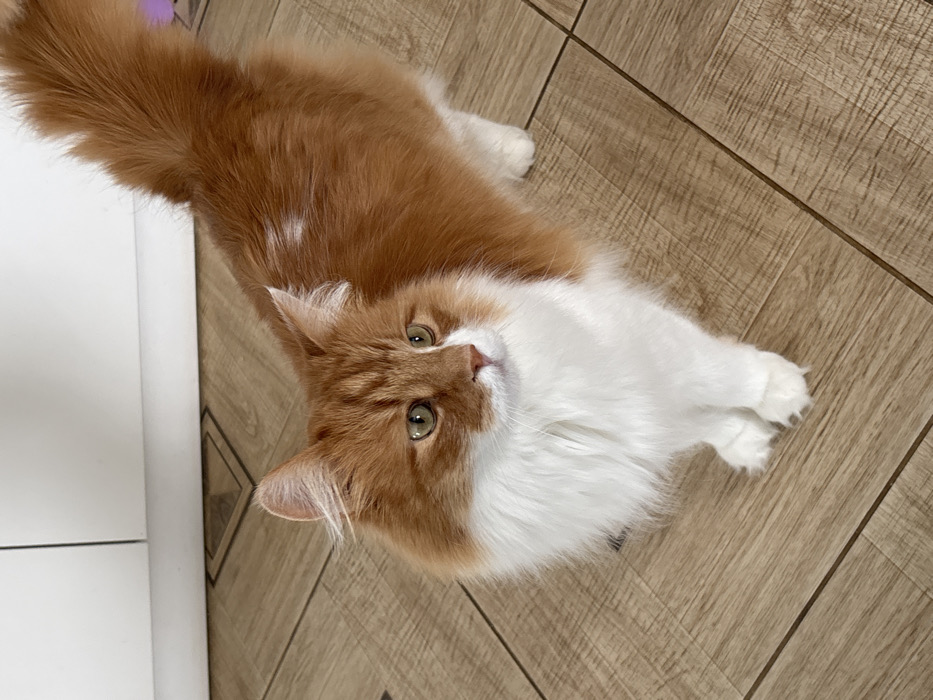 - "An indoor scene depicts a long-haired, bi-color cat standing on a light brown, wood-look tiled floor" by FM-KT4U62, licensed under CC BY 4.0