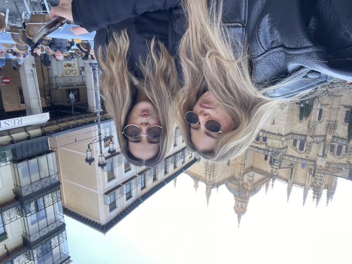 This image depicts two young adult females taking a selfie in the Plaza Mayor of Segovia, Spain