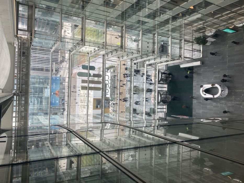 - "The image displays an elevated, downward-looking perspective within the multi-story glass and steel atrium of a modern building, located in the La Défense business district of Courbevoie, France" by FM-JcQ6F3, licensed under CC BY 4.0