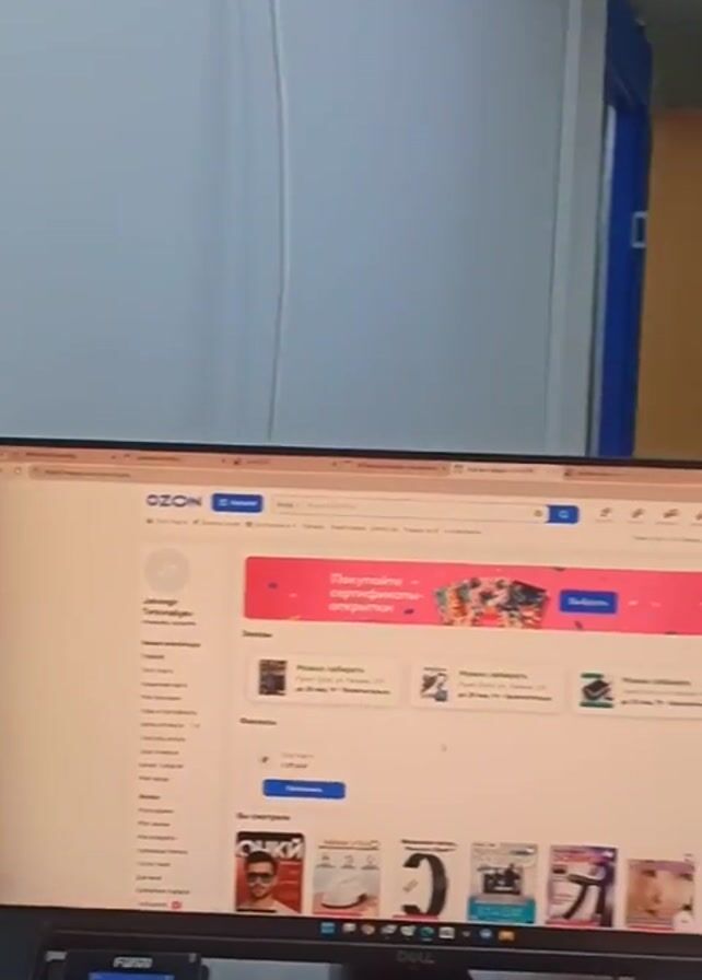 The video presents a brief pan across an office space. The camera starts by focusing on a computer monitor displaying an OZON webpage, then moves to show a second monitor and the overall office environment. The office appears functional and somewhat cluttered. Desks are visible, along with typical office equipment such as a printer, chairs, and filing cabinets. A small flag of Uzbekistan stands on one of the desks. The room is lit by fluorescent ceiling lights. The video lacks human presence or activity during the short duration recorded.