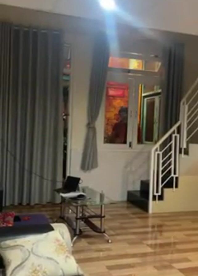 The interior of a two-story house is seen, with a person visible through an exterior window