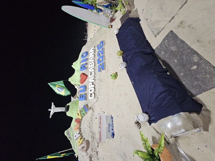 The image depicts a nighttime scene on Copacabana beach in Rio de Janeiro, Brazil
