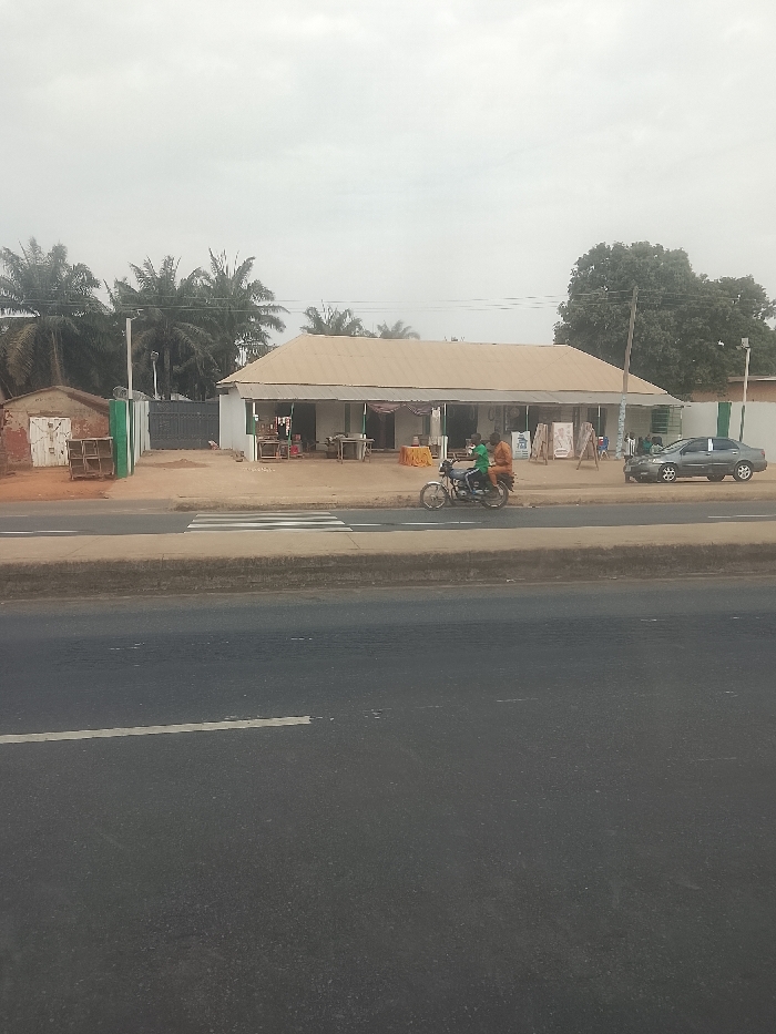 This image captures a street scene in Garaku, Nigeria, under an overcast sky. In the foreground, an asphalt road displays a white dashed line and, further back, a marked pedestrian crossing. A raised curb separates the road from a dirt shoulder. Two individuals are depicted riding a silver motorcycle from right to left across the pedestrian crossing; the driver wears a green shirt, and the passenger wears a light brown shirt. Behind the shoulder, a single-story building with white walls and a light-colored, possibly corrugated metal, roof dominates the center. It features an open front with an awning, revealing multiple tables and chairs, suggesting a commercial establishment. To the immediate left of this building, a dark green fence and gate are visible, followed by a smaller, older-looking reddish-brown building with a white door and wooden crates stacked outside. To the right of the main building, a dark grey sedan is parked on the dirt shoulder. A utility pole stands near the parked car, with power lines traversing the upper portion of the frame. The background is characterized by lush vegetation, including several tall palm trees on the left and a large, dense-canopied tree on the right.