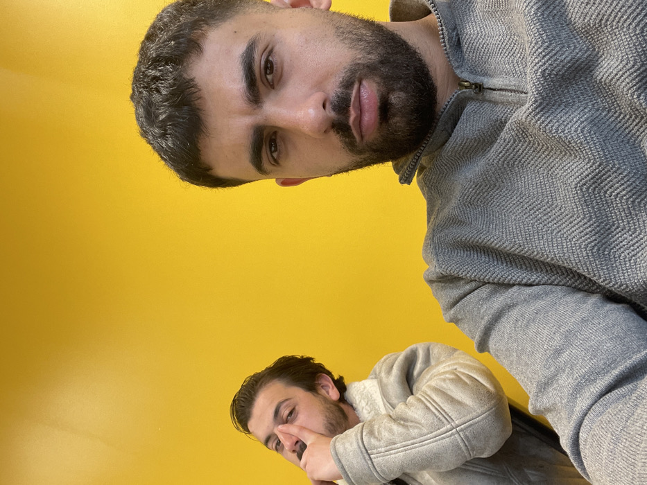 The scene depicts two adult males indoors against a uniform bright yellow wall, located in the city of Roubaix, France. The primary subject, positioned in the right foreground, presents his upper torso and head directly to the camera. He possesses a medium complexion, short dark hair, and a full dark beard. He is dressed in a grey quarter-zip sweater with a visible herringbone knit pattern. His expression is neutral, and his gaze is fixed on the camera lens. The secondary subject, located in the left background, also shows his upper torso and head. He has a medium complexion, dark hair styled back, and a lighter growth of facial hair. He wears a light-colored, possibly suede or shearling-lined, jacket. His right index finger is pressed against the right side of his nose, and his head is slightly tilted as he looks towards the camera. The illumination is consistent across the scene.