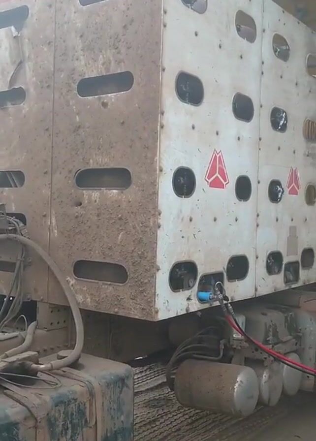 muddy, yellow truck with a trailer attached, parked at a gas station under a corrugated metal roof. The trailer has a series of oval openings along its sides, and red triangle markings are visible. The truck is connected to a gas pump via a hose. Another similar truck is visible further down the line. The ground is dusty. A small dog walks by in the background.