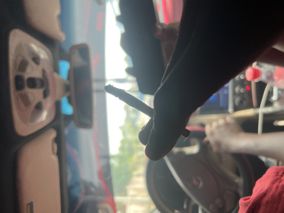 The image captures the interior of a vehicle, viewed from a front-seat perspective looking through the windshield. A dark-skinned hand, silhouetted in the foreground, holds a lit, partially consumed cigarette or hand-rolled joint, with ash visible at the tip. The driver's hands, wearing a red garment on the left arm, are positioned on the steering wheel, which features a logo consistent with a Mercedes-Benz vehicle. A red-capped plastic bottle is present in the center console area. Overhead, the vehicle's console with control buttons, sun visors, and a rearview mirror are discernible but out of focus. Through the windshield, a blurred outdoor environment consists of green foliage and indistinct structures, indicative of a roadside setting under daylight conditions. This scene is located in Lokoja, Nigeria.