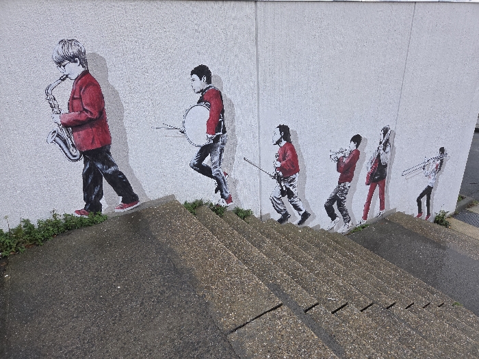 An outdoor scene in Hérouville-Saint-Clair, France, displays a mural on a light grey, textured wall that runs parallel to a concrete staircase. The mural features six stylized figures depicted as a marching band, ascending from left to right along the wall, mirroring the upward slope of the adjacent steps. Each figure is rendered in black and white with distinct red accents on their clothing. From left to right: a boy with glasses plays a saxophone; a boy carries a snare drum and drumsticks; a boy holds a drum major's mace; a boy plays a trumpet; a figure plays a bass guitar; and a figure plays a trombone. All figures face forward, appearing to be in motion. Green foliage grows at the base of the wall between the mural and the coarse grey concrete steps.