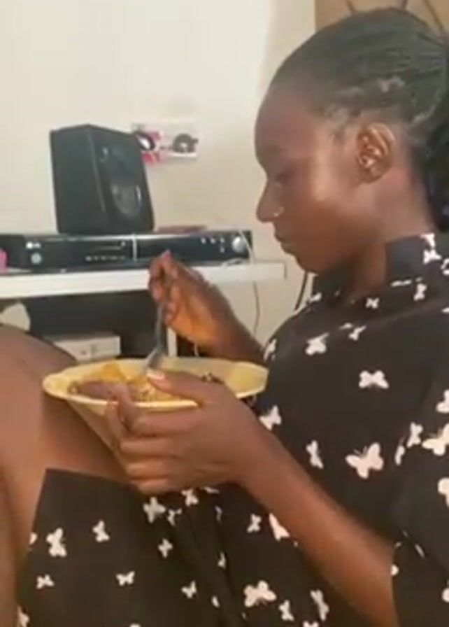 A young woman is sitting indoors, eating a meal of rice, beans, and what appears to be boiled yams. She is using a fork to eat from a yellow plate, which is held on her lap. She is wearing a short black wrap dress with a white butterfly print and has her dark hair pulled back in a ponytail. The room is sparsely decorated, with a white desk visible in the background. On the desk, there is a black speaker, a DVD player, a book, and other small objects. There is also a brown headboard to the right of the woman.