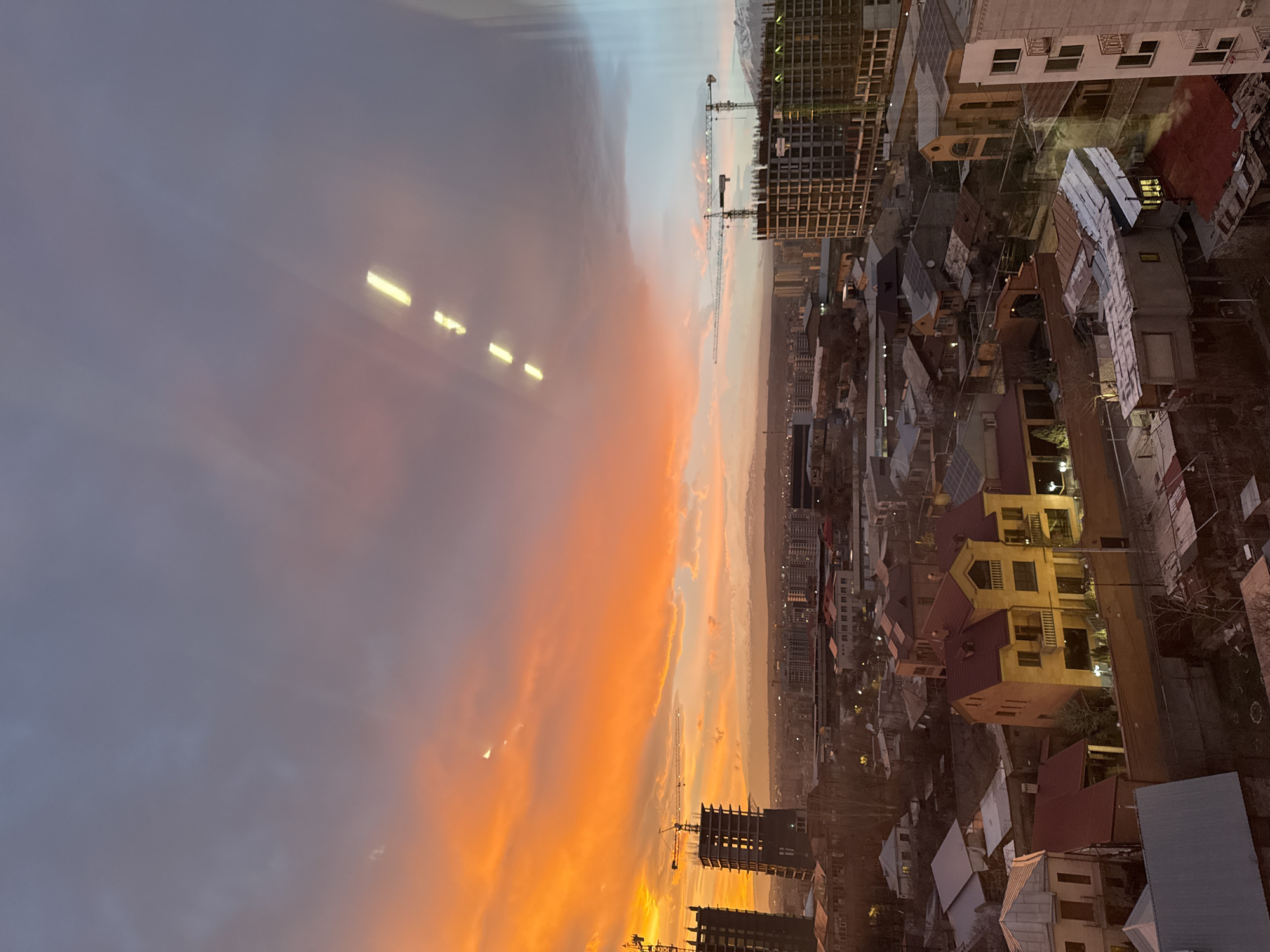 An elevated view of Yerevan, Armenia, is depicted during twilight, exhibiting a sky transitioning from a vivid orange, red, and yellow on the left to a muted gray-blue on the right. A faint crescent moon is visible in the colorful sky. Four distinct, elongated, rectangular yellow light reflections are present on the upper right, indicative of the image being captured through a window. The urban landscape features numerous structures. In the midground, multiple active construction sites are evident, characterized by several tower cranes and partially built high-rise structures on both the left and right sides of the frame. The foreground and midground contain a dense residential area, composed of various multi-story homes, some with red roofs and illuminated exterior lights, interspersed with smaller dwellings. Distant, snow-capped mountains are visible on the horizon. No human subjects or discernible actions are present.
