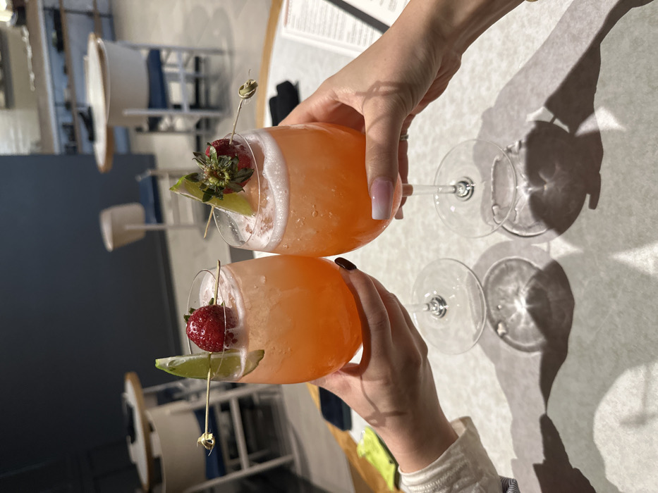 Two stemmed glasses containing an orange-pink, effervescent beverage are clinked together in the foreground of a modern restaurant setting
