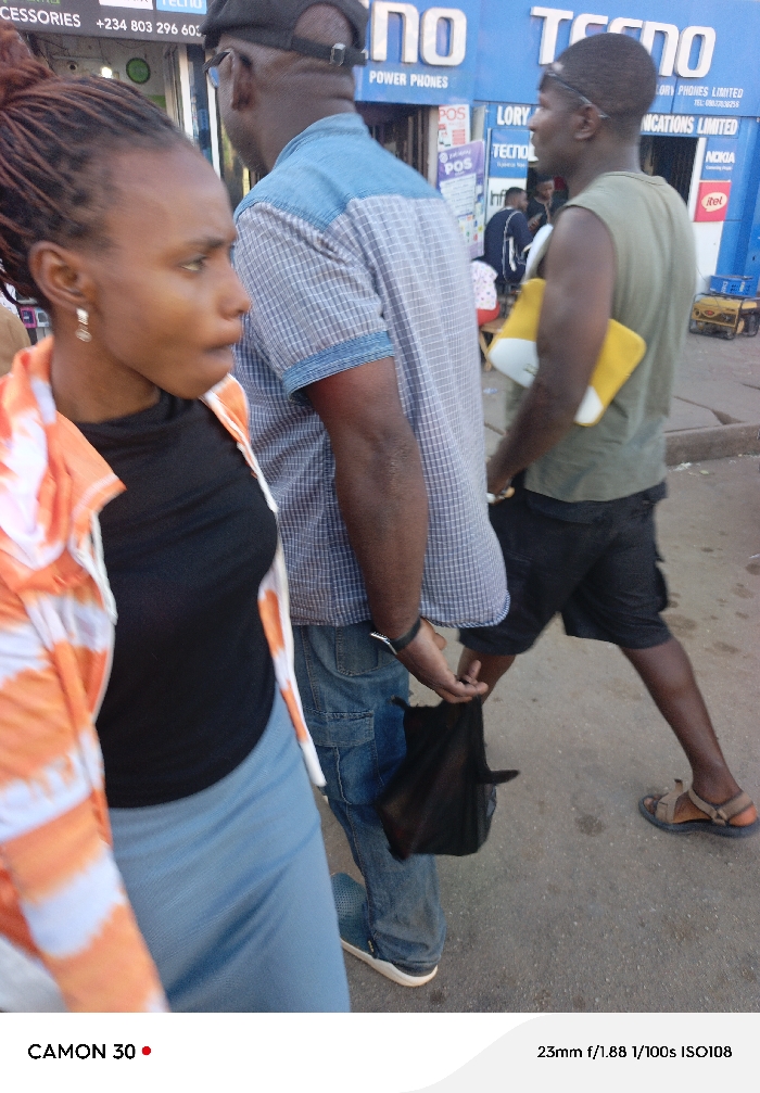 The image displays an urban street scene in Jos, Nigeria, capturing three individuals walking past a commercial establishment. In the foreground, partially cropped on the left, a female individual with brown dreadlocks and an earring is visible, oriented to the right. She wears a black top, a light blue skirt, and an orange and white tie-dye patterned long-sleeved outer garment. Behind her, a male individual, seen from behind, walks to the right. He wears a dark cap, glasses, a blue and white checkered short-sleeved shirt with solid blue shoulder sections, and blue jeans, carrying a black plastic bag in his right hand. To the right, another male individual walks in the same direction, viewed from his right side. He wears a dark green sleeveless shirt, dark shorts, and brown sandals, holding a yellow and white object under his left arm. Sunglasses are perched on his head. The background features a prominent blue storefront sign reading "TECNO POWER PHONES" with "LORY PHONES LIMITED" and contact information, including a "+234" (Nigeria's country code) phone number, below it. Additional signs for "POS," "NOKIA," and "itel" are visible. Generators are positioned on the right side of the background. The ground surface is paved, consistent with a street or sidewalk. All three individuals appear to be in motion, generally moving from the left to the right side of the frame.