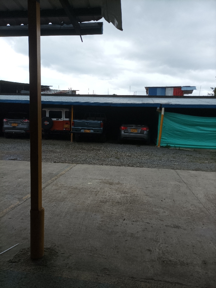 Under a cloudy sky, four vehicles are parked in a row beneath a covered structure with a blue roof. The first vehicle on the left is a gray SUV, followed by an orange and white truck. Next is a dark pickup truck, and a gray car is parked last on the right. A green tarp hangs off to the far right of the parking area. A thick wooden pole obscures a small part of the image on the left, and a concrete pavement covers the foreground.