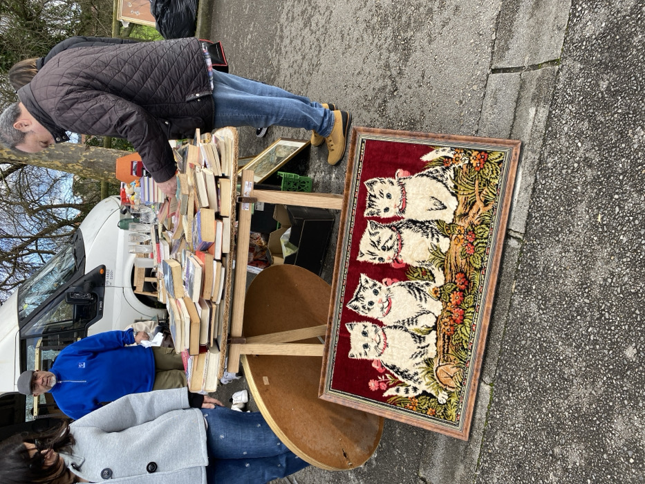 This image captures an outdoor second-hand market scene in Gijón, Spain. In the foreground, a framed tapestry rests horizontally on grey asphalt, depicting four cartoon-style kittens with striped grey and white fur and red bows, seated on a log amidst green foliage and red flowers against a dark red backdrop. Directly behind this, a wooden market stall with two trestle legs supports a tabletop covered with numerous stacks of books. Several glass flutes and an orange object are also visible on the table. To the left of the stall, a large, oval-shaped wooden tabletop leans against its structure. Four individuals are present. On the far left, a woman wearing a light grey jacket and blue jeans is partially visible from the chest down, facing the stall. Behind the stall, a man with a grey cap and a blue long-sleeved top stands, looking forward. On the right side of the stall, a man in a dark brown quilted jacket, blue jeans, and tan work boots leans over the table, using his right hand to browse or select books. A fourth person, mostly obscured by this man, is partially visible behind him. In the background, a white Ford Transit van is parked. Beyond the van, sparse trees with bare branches and a wooden fence are visible under an overcast sky. A black trash bag and a green plastic crate are also discernible beneath and around the market stall.