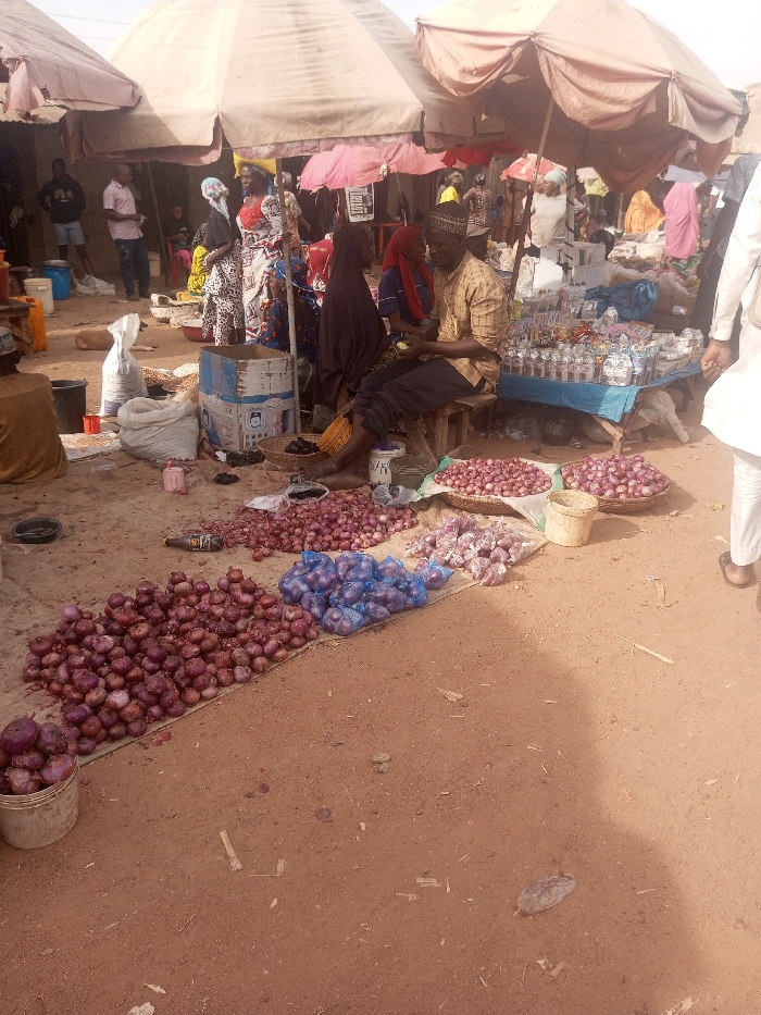 The image displays an active open-air market scene in Kakuri Gwari, Nigeria
