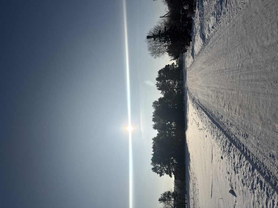 The scene depicts a snow-covered rural landscape under a clear, bright sky in Капцёўскі сельскі Савет, Belarus. A sun, low in the sky, is centrally positioned, emitting a strong horizontal lens flare. A snow-covered, unpaved road with visible tire tracks extends from the foreground into the mid-ground, curving slightly to the right. To the left of the road is an expansive snow-covered field displaying scattered footprints. A dense line of dark conifer trees forms a silhouette across the mid-ground, bordered by additional bare deciduous trees on the left and right. On the far right, bordering the road, are more bare trees, a darker conifer, and faint indications of utility poles and a partial fence or gate structure. A road sign, potentially a curve indicator, is partially visible in the distance on the right side of the road. The entire environment is covered in white snow, indicating a winter setting, with bright sunlight illuminating the scene. No individuals or animals are present.